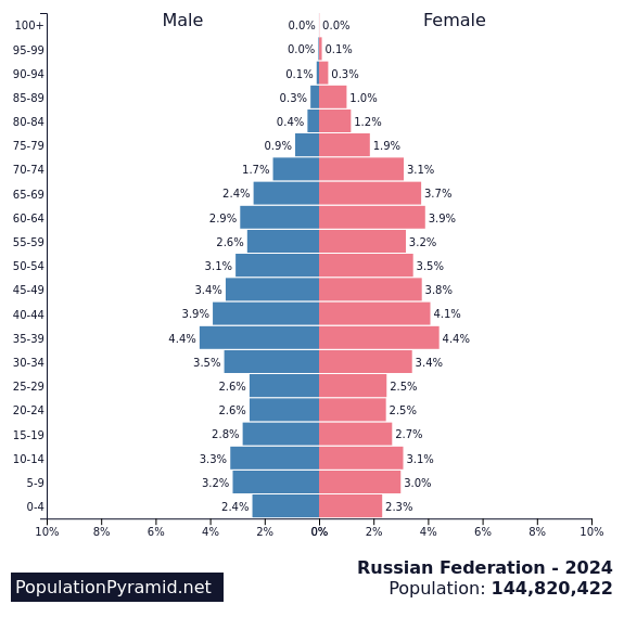 This is just about the worst kind of pyramid you can have. The largest group 35-39 year olds, the groups under 25 should be forming the base of a pyramid, not contracting at this pace into a column. The older male side of the pyramid is far smaller than the female side due to war, alcoholism, work conditions and poor health care. Ukraine’s pyramid is not much different, particularly as war is not a good time to have children, births are low.