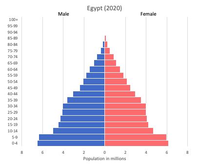 By way of comparison look at the far more consistent and even spread of US population age groups, and those of Egypt where a genuine pyramid and hyper expansion of the population is largely unsustainable.