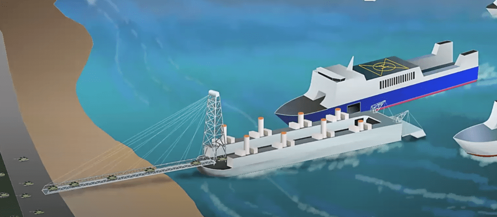 What you’re looking at is a floating roadway. It’s not designed to transport anything but the bridging equipment. It approaches the shore, lowers between 4 and 8 stabilizing legs (there are three sizes of these under construction), deploys the bridge and opens its tail gate.