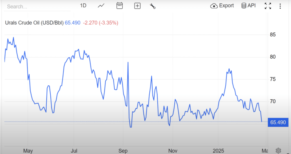 But Russia exports very little anyone much cares about except commodities and the most important of those is its crude oil . That is now trading at almost half what it was in early 2022, and has fallen $20 per barrel since May last year, trading at just short of $65.50 now and its on a downward trend.