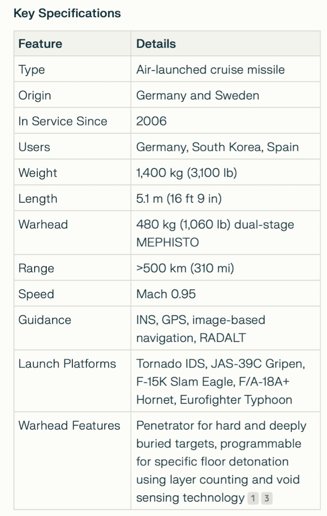 Taurus KEPD 350 is a German-Swedish air-launched cruise missile developed by Taurus Systems GmbH, a joint venture between MBDA Deutschland and Saab Bofors Dynamics. It is designed for precision strikes against hardened and high-value targets, including bunkers, command centers, airfield and port facilities, ammunition depots, ships, and bridges – and we all know the one bridge these actually could bring down.