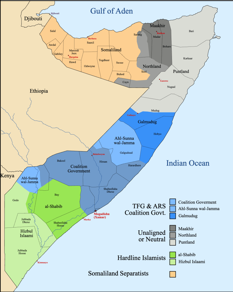 Across the Red Sea in Somalia there are three competing regions. Puntland in the north east, which is separated from its western neighbor, Somaliland, by a larger area they dispute. To the south is the official full government of Somalia based in Mogadishu. Somaliland acts entirely independently even though few recognize its existence as a separate state. Puntland tries to remain out of the argument while there’s nothing the central government can do, it has islamic militants to its south. Somaliland has actually become quite a successful state – supported by the UAE and recently recognized by Turkey and Ethiopia. Ethiopia needs to build a railway to bypass the state of Djibouti which is now seething with Chinese influence and a military base, and was its only export outlet by sea. Somaliland offered an alternative and the UAE is good at building ports. None of which the Saudis like and they go out of their way to block recognition of Somaliland as a separate nation. All of this is of course just a stones throw over the water from the conflict in Yemen.